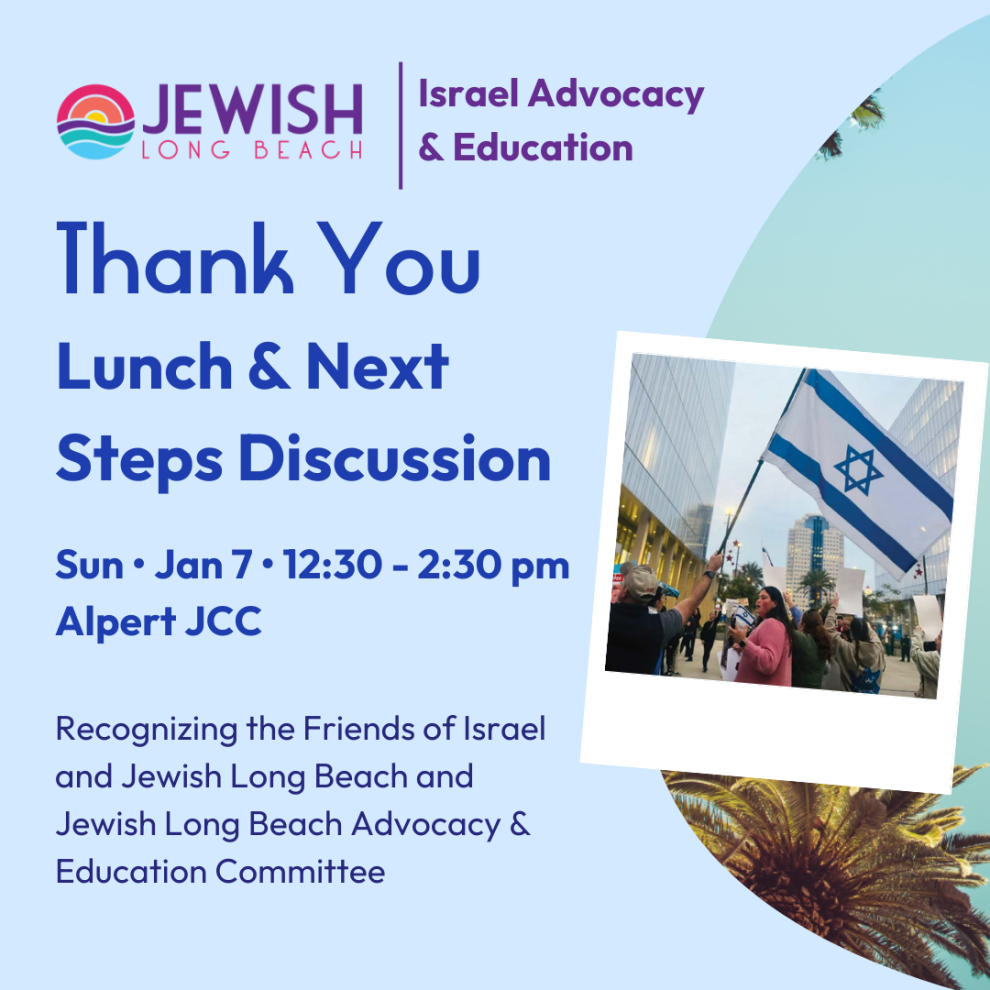 Join us for a lunch in recognition of the Friends of Israel and Jewish Long Beach and the Israel Advocacy & Education Committee, and discuss the next steps following the Long Beach City Council meeting. Please click here to RSVP online.