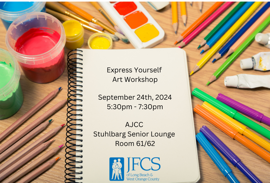 Jewish Family & Children's Service (JFCS) of Long Beach & West Orange County invites you to a fun, informal workshop on self-expression through art. Facilitated by Hila Abada, LCSW. This workshop is open to anyone 10 years and older, no training or ability in art is necessary. All materials provided. This event is limited to 25 participants. This workshop is free and open to the community!