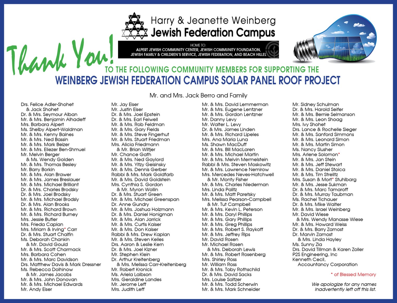Below are listed the names of all those community members who helped contribute gifts to the project. The campus and the community thank you.