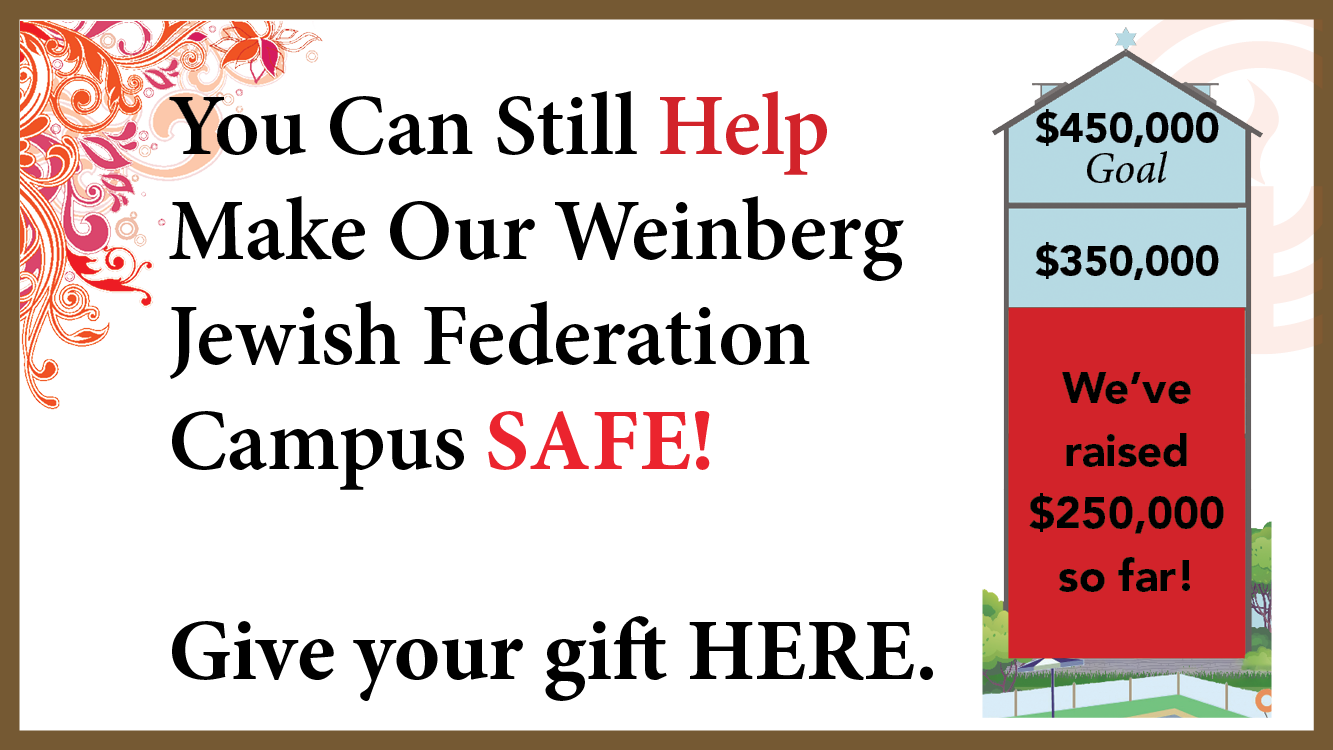 This special event raised funds to support security enhancements on our Weinberg Jewish Federation Campus. The evening raised just over $105,000, together with a $150,000 federal grant secured from Homeland Security, puts us at a little more than half our goal of $450,000.